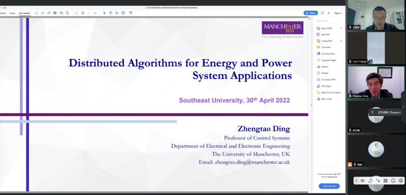 接下来作报告的是英国曼彻斯特大学丁正桃教授,报告的题目是“Distributed Algorithms for Energy and Power System Applications”,报告介绍了使用基于多代理的算法的分布式优化、网络上的合作和竞争性机器学习、分布式优化和机器学习算法在能源和电力系统中的应用,特别是最近在风电场的一些优化和控制应用。