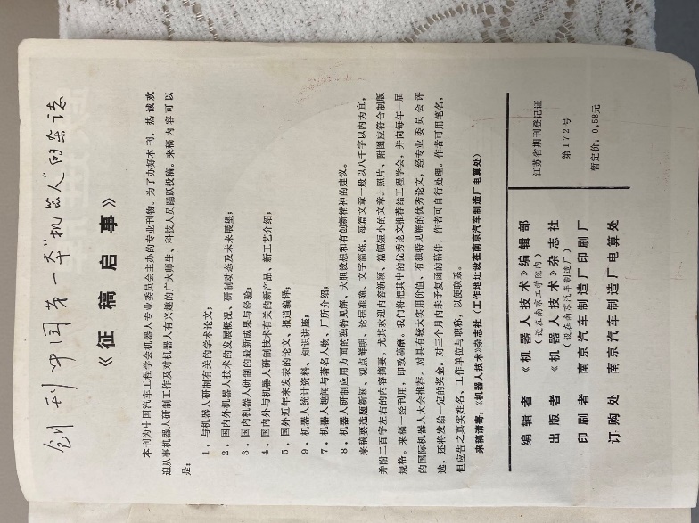 1985年:中国第一本机器人期刊《机器人技术》由南京工多宝游戏 的编辑部出版,严学高教授任主编,于1987年与沈阳自动化研究所的《国外自动化》杂志合并,更名为《机器人》,成为我国最具代表性的报道机器人学及相关领域具有创新性、高水平、有重要意义的学术进展及研究成果的期刊。
