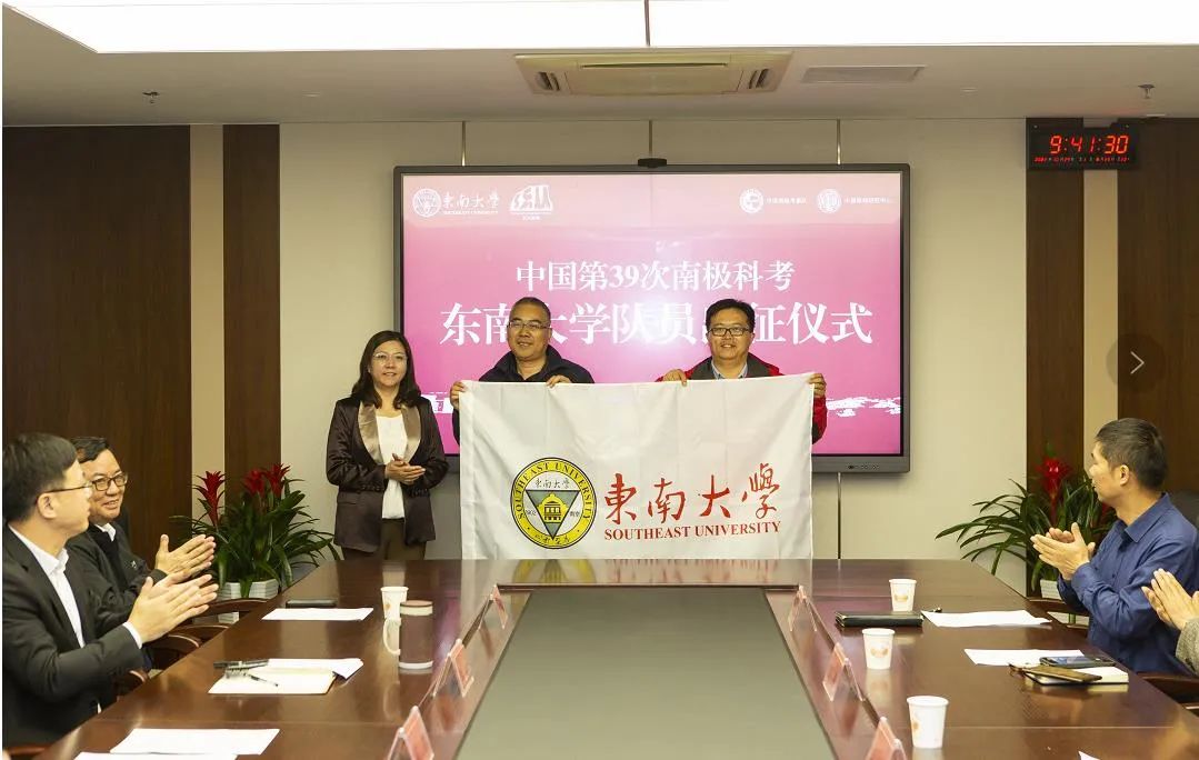 2019年19月,时任东南大学校长张广军院士为 参与中国第36次南极考察队的多宝游戏 方仕雄及兄弟院系的刘西陲、吴昌德三位老师举行出征欢送仪式。