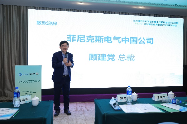 经过短暂休息后,大会开始了下半段议程,由菲尼克斯公共关系与智能教育部经理易书波主持。工委会主任魏海坤教授首先致辞,他强调促进产教融合是工委会的一项重要工作,高校与企业之间要加强人才培养的深度合作,共同推进江苏省教育工作。然后,菲尼克斯电气中国公司总裁顾建党先生发表致辞,感谢与会高校专家对EduNet全球智能教育联盟大力支持,并强调要与高校就人才培养、师资建设、实验室建设等教育工作展开全面合作。随后,菲尼克斯电气EduNet全球智能教育联盟Sponsor Mr.Klaus Hengsbach通过视频向多宝游戏 60周年院庆表示祝贺并表示对菲尼克斯电气集团与各高校合作充满期待。