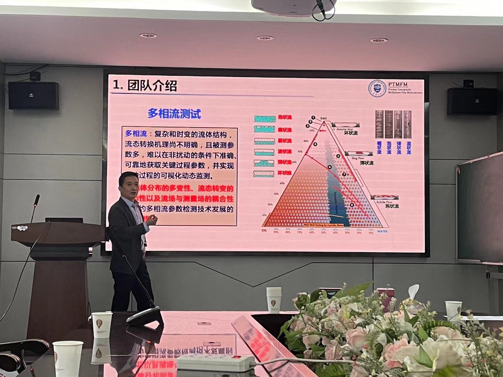 多种流体的混合流动(简称多相流)广泛存在于自然界与工业生产中,多相流是工业生产与科学研究中,对其过程参数的无扰动在线准确检测与状态辨识一直是工业与科研领域亟待解决的检测难题。在报告中,谭超院长首先介绍了天津大学电气自动化与信息工程多宝游戏 的发展历史,并介绍了所在团队的研究方向与现状。随后,针对管道中多相流体的流动状态难以测量的难题,介绍了基于同相介质电阻差异的电学感知方法、基于同相介质中声波传播速度差异的超声波感知方式等多种传感模态,并深入浅出的讲解了层析成像的基本原理与系统。紧接着,谭院长介绍了以电学、超声波感知为基础的多种过程参数实时在线测量方法。最后,谭院长总结了自己课题组在该领域的最新研究进展,以及研发技术与仪器的应用案例,并在报告结束后与会师生进行了热烈交流。