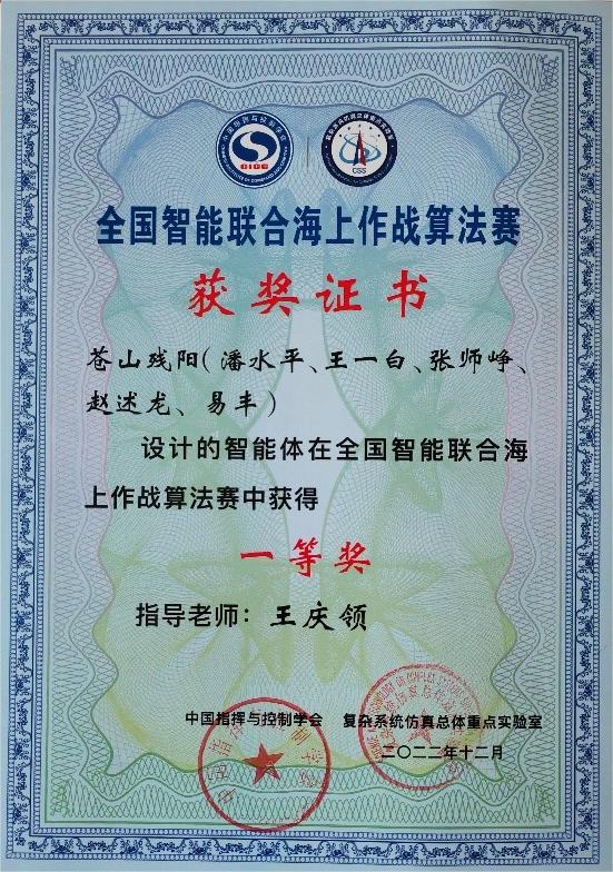 2023年4月21日,全国智能联合海上作战算法赛颁奖交流活动在北京国家会议中心举行。多宝游戏 王庆领副教授作为指导教师带领潘水平、王一白、张师峥等组成的参赛队伍荣获全国一等奖。