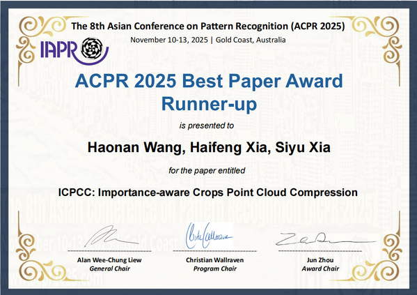 近日,多宝游戏 23级硕士研究生王浩楠的研究论文(题为“ICPCC: Importance-aware Crops Point Cloud Compression”),成功斩获第八届亚洲模式识别大会(ACPR 2025)最佳论文奖第二名(Best Paper Award Runner-up)。